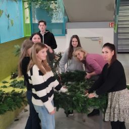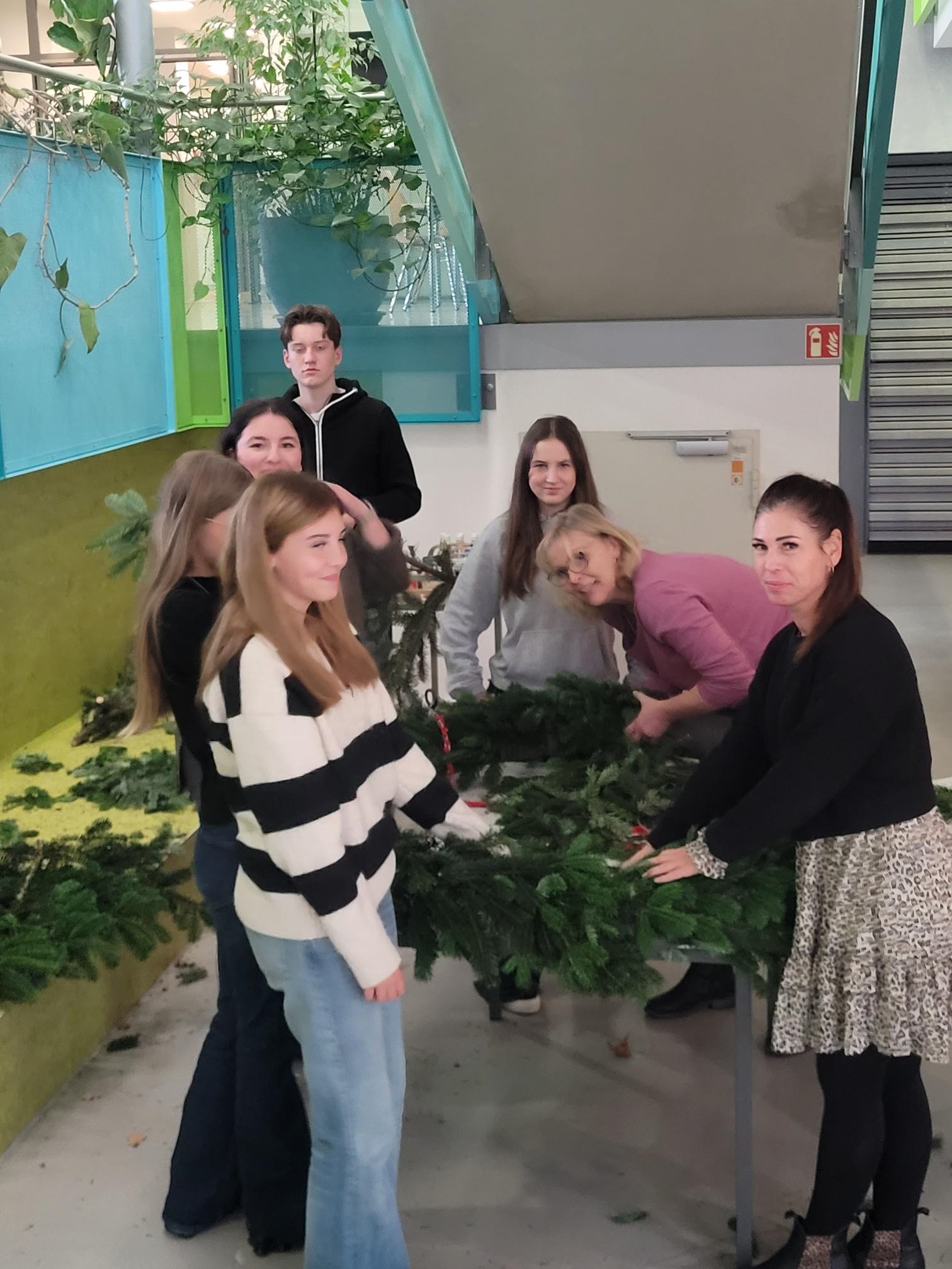 Mit tatkräftiger Unterstützung einiger fleißiger Schüler aus der Klasse 9a, Frau Ruetz-Jonasson, dem Sekretariat und unserem Hausmeister haben wir unseren großen Weihnachtskranz mit Reißig gekranzt und schön dekoriert.