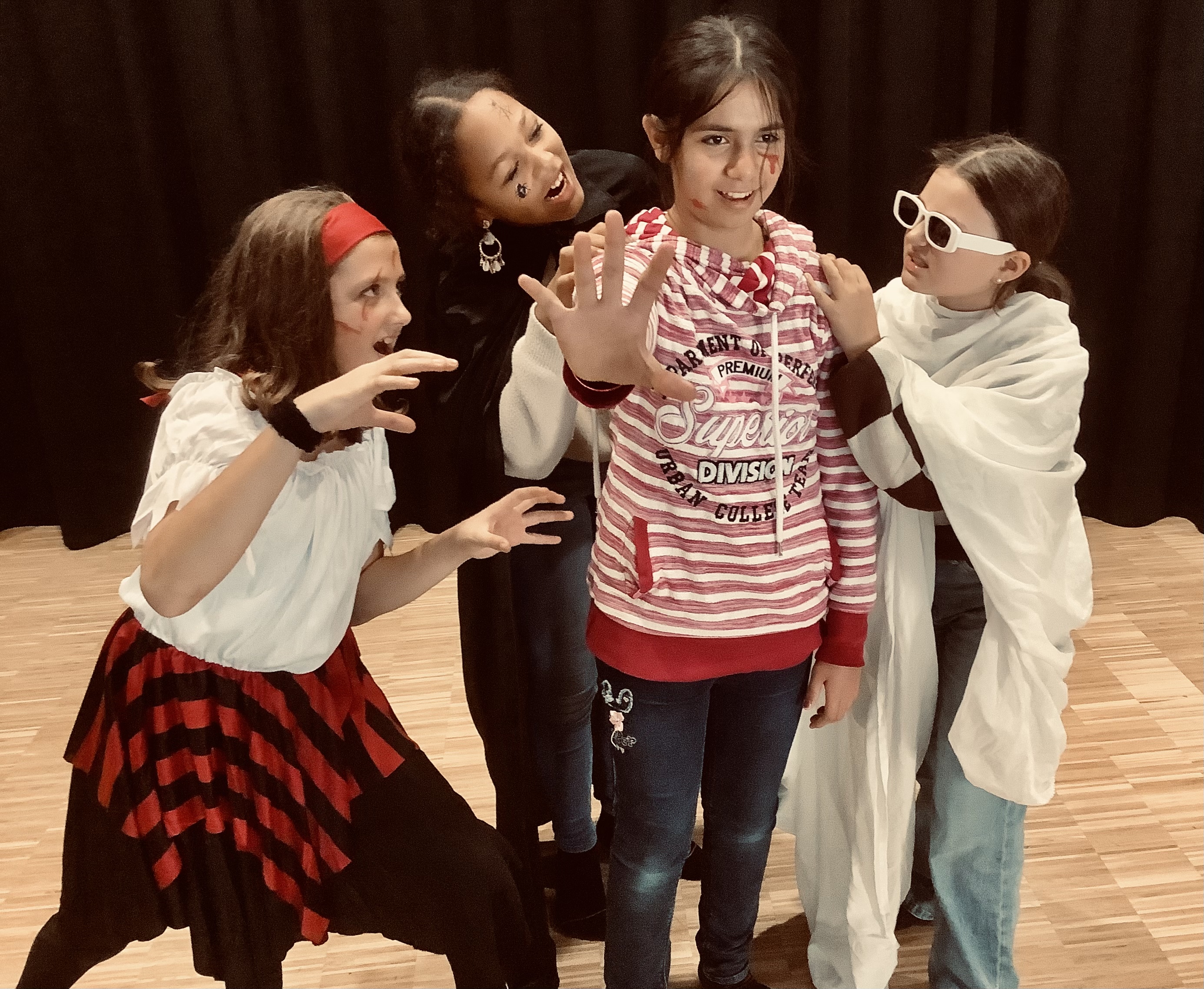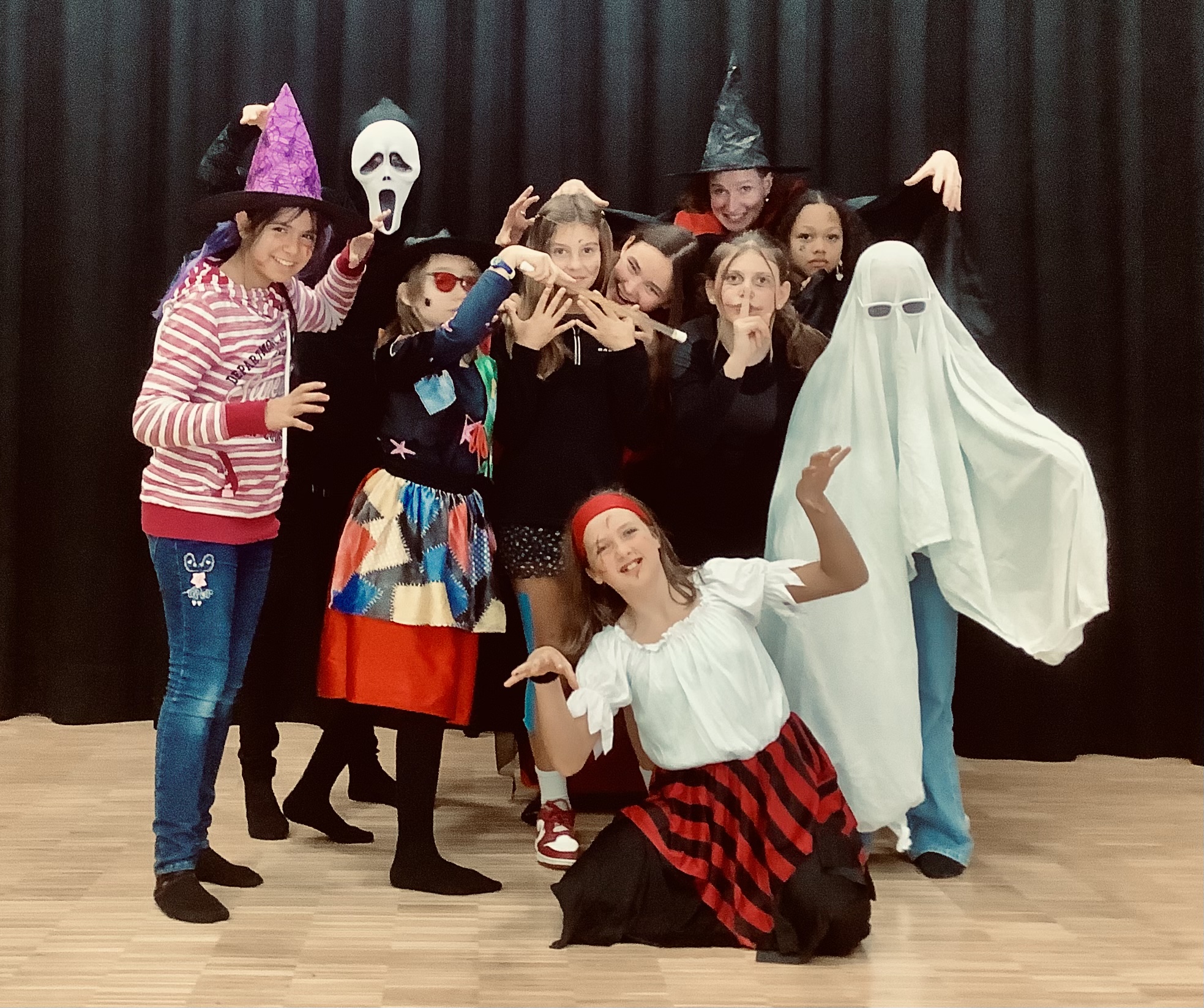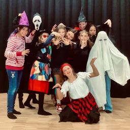 Am Mittwoch, 26.10.22, wurde es in der Mensa auf der Bühne des BZM gruselig. Wir, die Teilnehmer der Theater-AG, verwandelten uns in Zombies, Hexen, Vampire, Geister und sonstige schauerhafte Gestalten. Auch der Boden verwandelte sich auf zauberhafte Art und Weise in Matsch und Glibber, ließ Tote auferstehen und Spinnen krabbeln. Zombies tanzten zu Michael Jacksons „Thriller“ oder sie verfolgten zwei nichts ahnende Spaziergänger und jagten ihnen Angst und Schrecken ein. Geübt wurde auch das plötzliche Stehenbleiben – in der Theatersprache auch „Freeze“ genannt. Zudem haben wir gruselige Halloweengeschichten erfunden und vorgespielt.