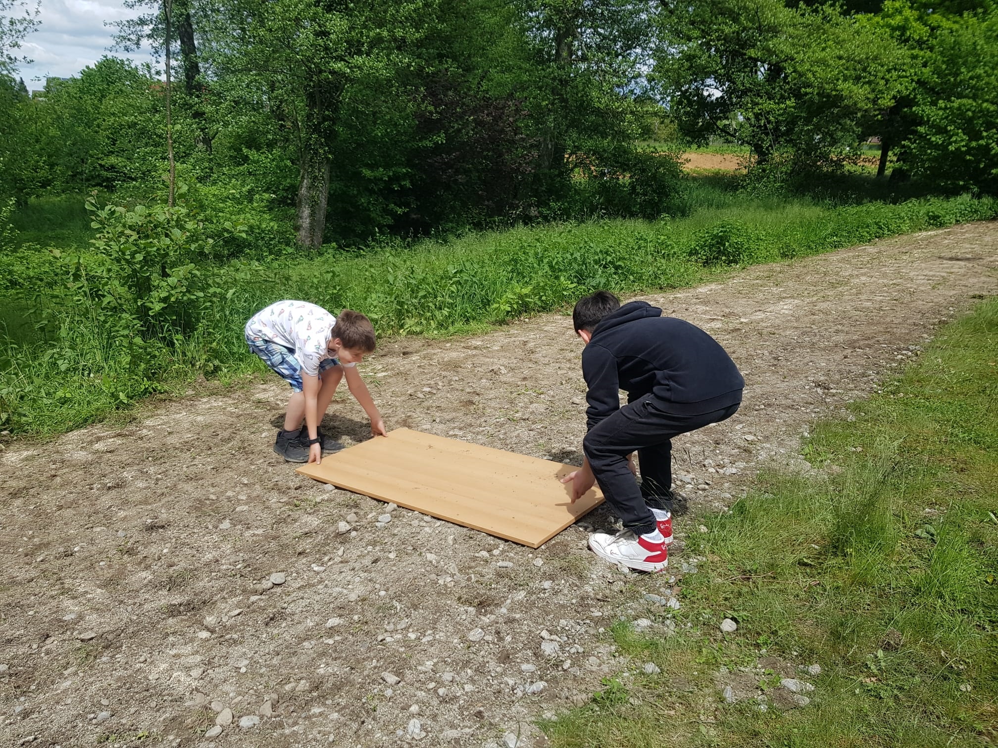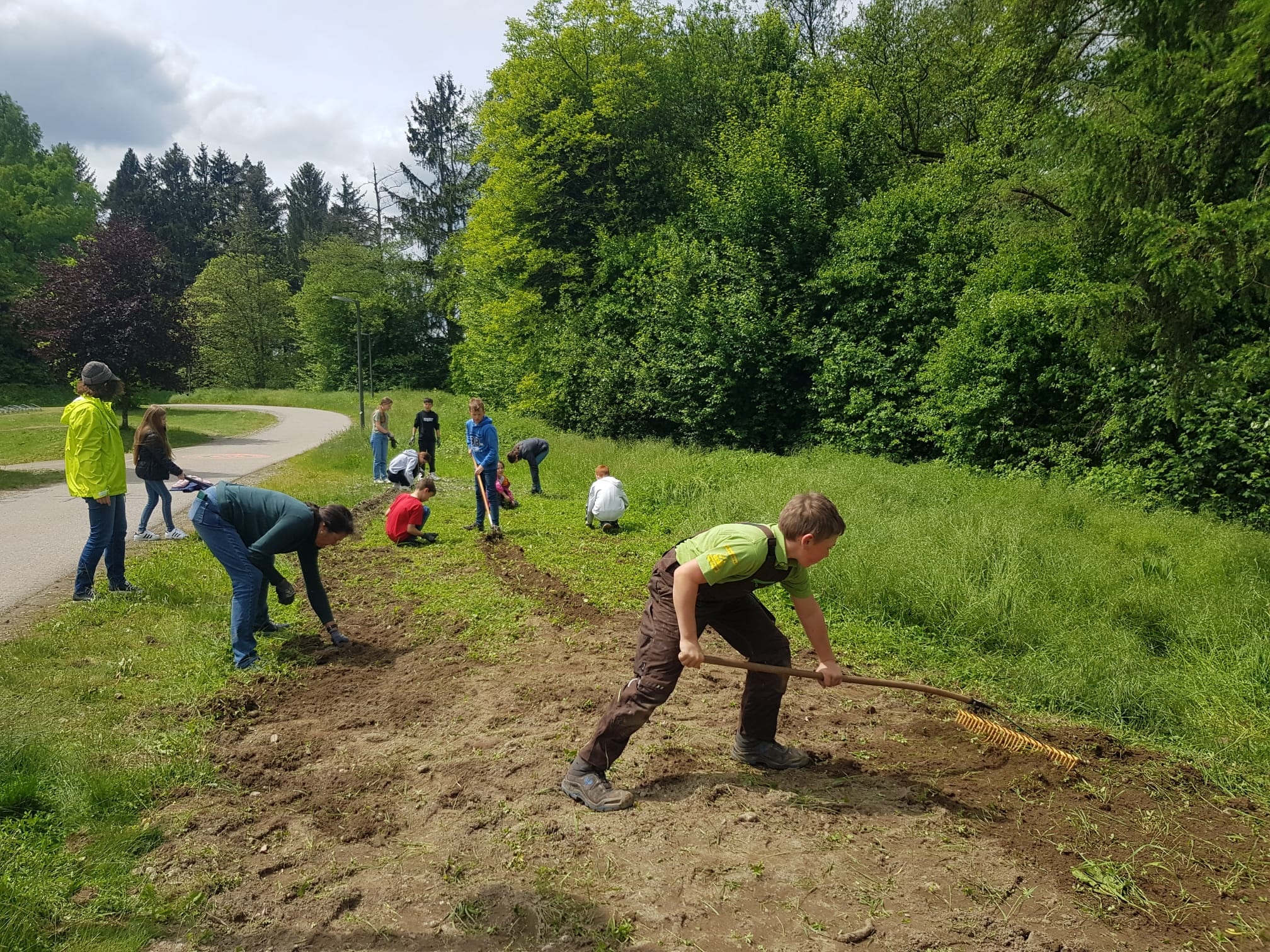 Auf Grund des kalten und nassen Wetters hat sich der Termin für die Aussaat lange hingezogen und die Natur AG musste mit großem Arbeitseinsatz den Boden nochmals von Hand bearbeiten, um das nachgewachsene Gras wieder zu entfernen. Gemeinsam wurde diese Arbeit mit Humor und Engagement bewältigt, sodass die Aussaat nun endlich stattfinden konnte.