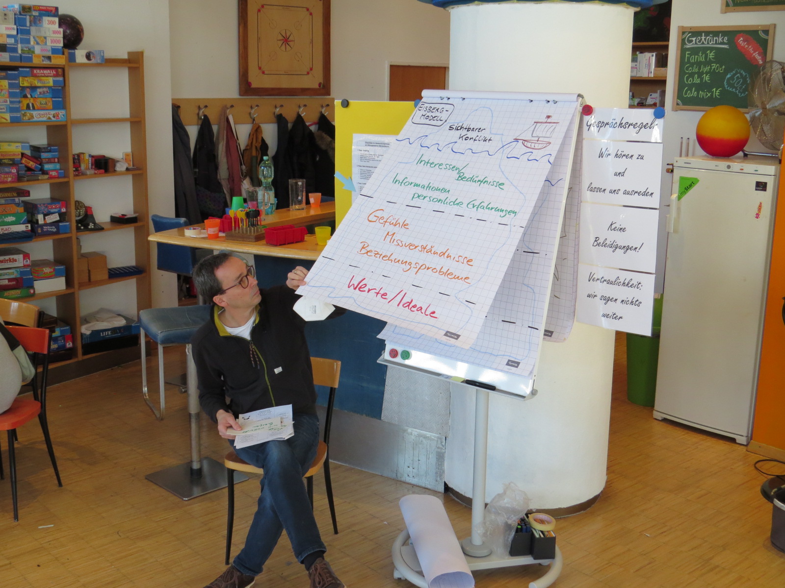 Zu der Ausbildung gehört z.B. zu überlegen, wie man selbst mit Konflikten umgeht und wie man Gespräche so führen kann, dass alle zu Wort kommen und ihre Meinung sagen können.