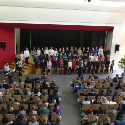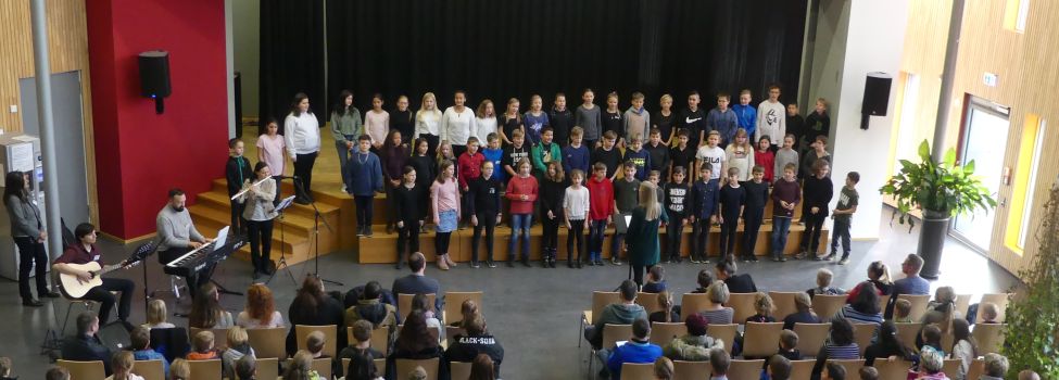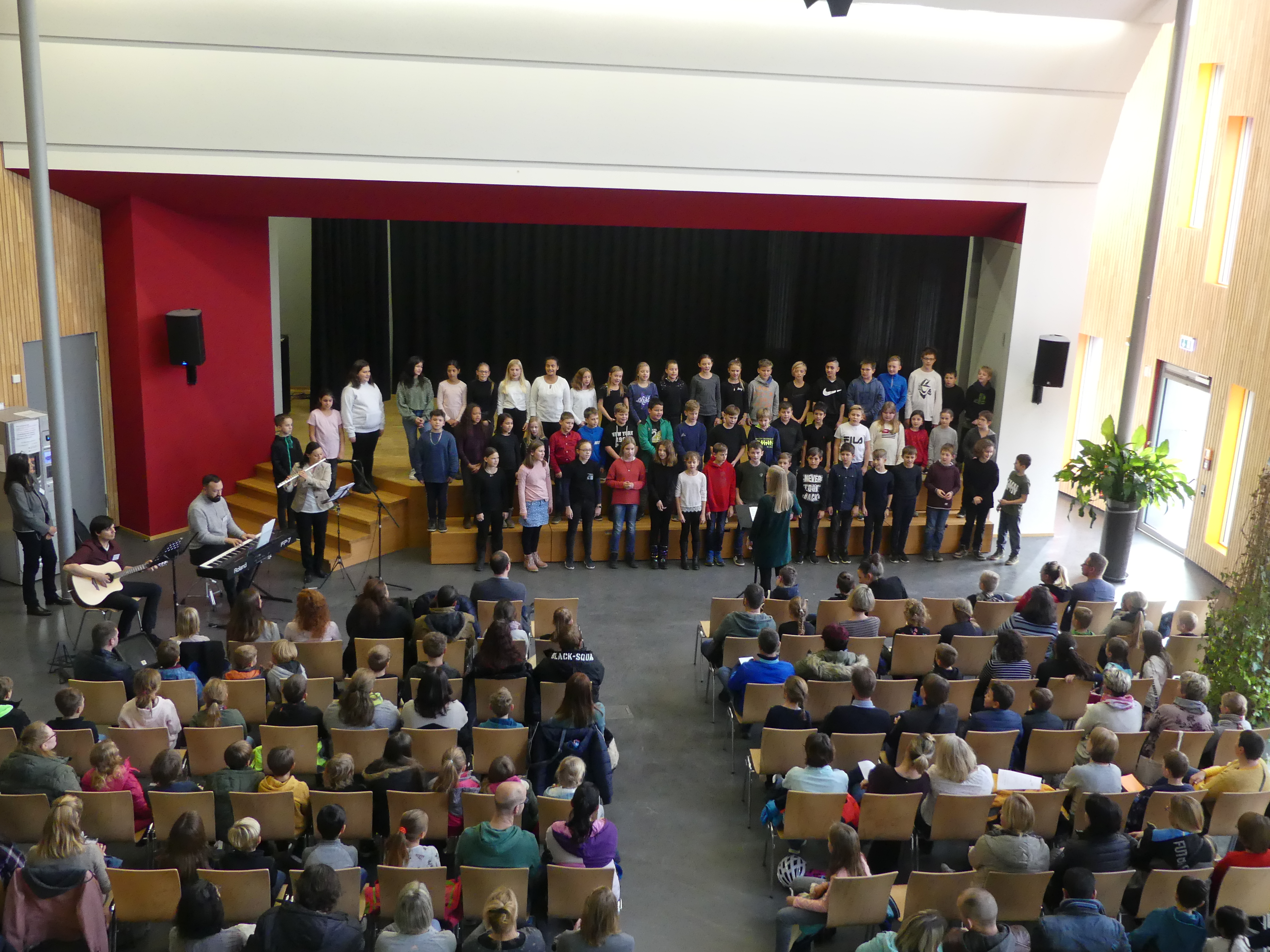 Nach einem musikalischen Intro durch die Schulband begrüßte Frau Wiedmann die GrundschülerInnen mit ihren Eltern in der Aula/Mensa und Herr Walker erklärte den Ablauf des Nachmittags.