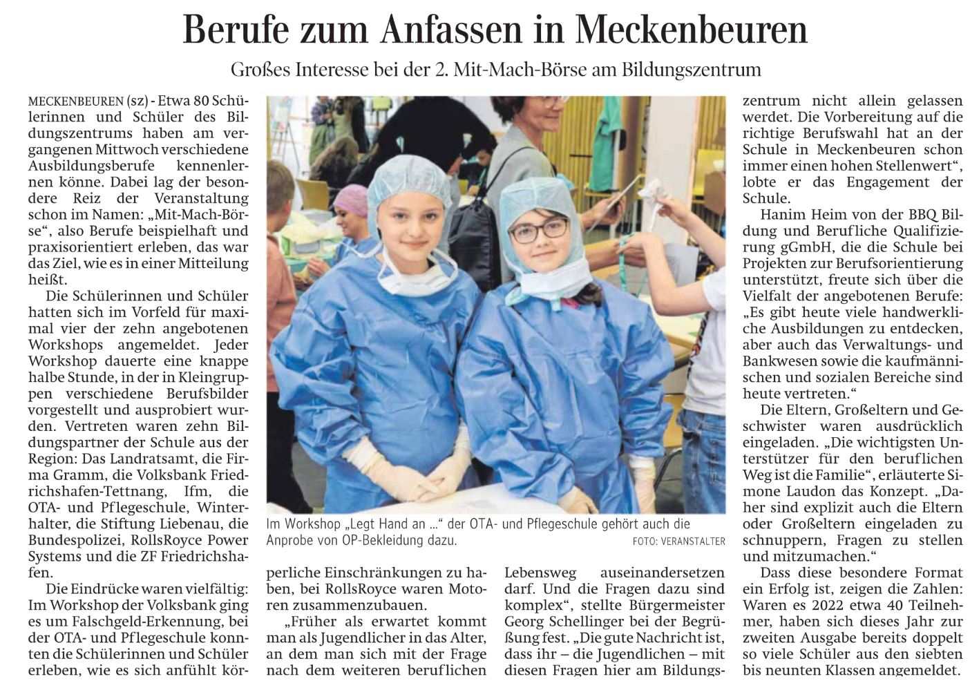 Ausbildungs- und Studienplatzsuche gestaltet sich nicht immer leicht. Hunderte von beruflichen Möglichkeiten und Wege stehen zur Verfügung. Hier möchte das Veranstaltungsformat „Mit-Mach-Messe-Meckenbeuren“ eine Antwort geben. SCHULEWIRTSCHAFT Baden-Württemberg, der Bildungsträger BBQ Bildung und Berufliche Qualifizierung gGmbH sowie das Bildungszentrum Meckenbeuren gehen zusammen neue Wege. Am 10. Mai fand im Schulzentrum die „2. Mit-Mach-Messe“ statt. Zusammen mit Ausbildern und Personalverantwortlichen gaben die Veranstalter Auskunft über die aktuellen Berufe und deren Anforderungen aus der Region Meckenbeuren.