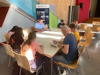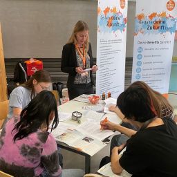 So konnten die jungen Besucher mit ihren Eltern am Mit-Mach-Stand der Bundespolizei sich über gefälschte Pässe informieren und mit dem Einstellungsberater ins Gespräch kommen. In sechs Workshoprunden suchte er Fehler und informierte über die beruflichen Möglichkeiten bei der Bundespolizei. Am Stand der Volksbank wurden Geldscheine auf Sicherheitsmerkmale untersucht. Die Berufewelt der Volksbank wurden in dem Zusammenhang dargestellt. Die jungen Menschen waren sich im Anschluss einig, dass sie nun sowohl auf die Reisepässe als auch auf die Geldscheine anders schauen und betrachten.