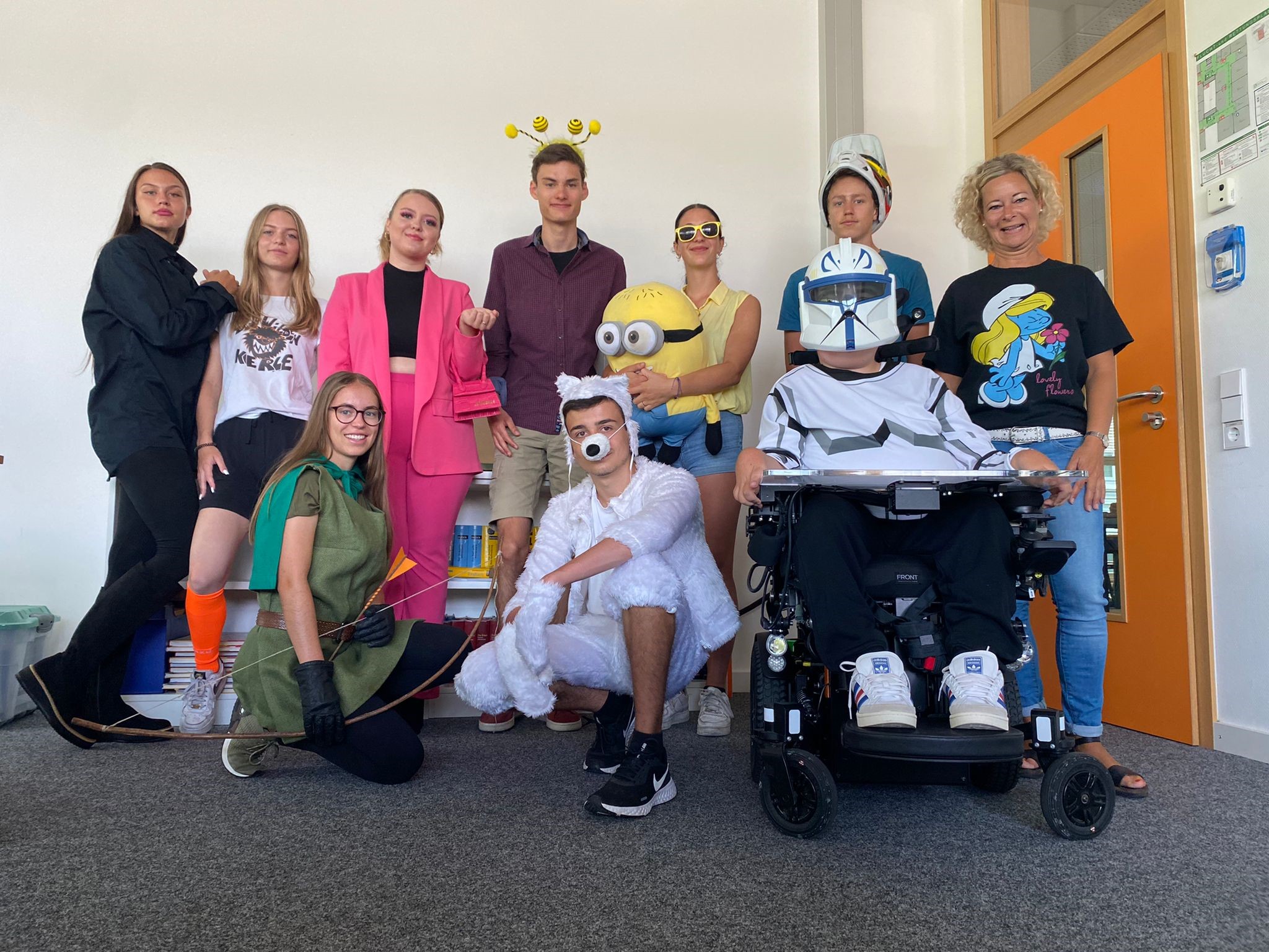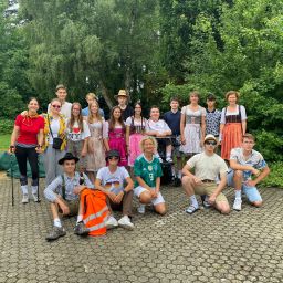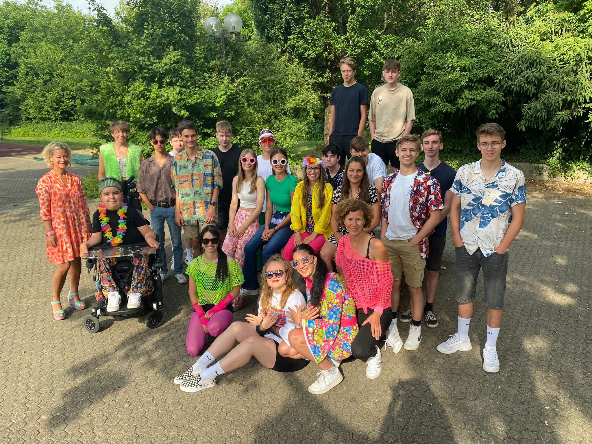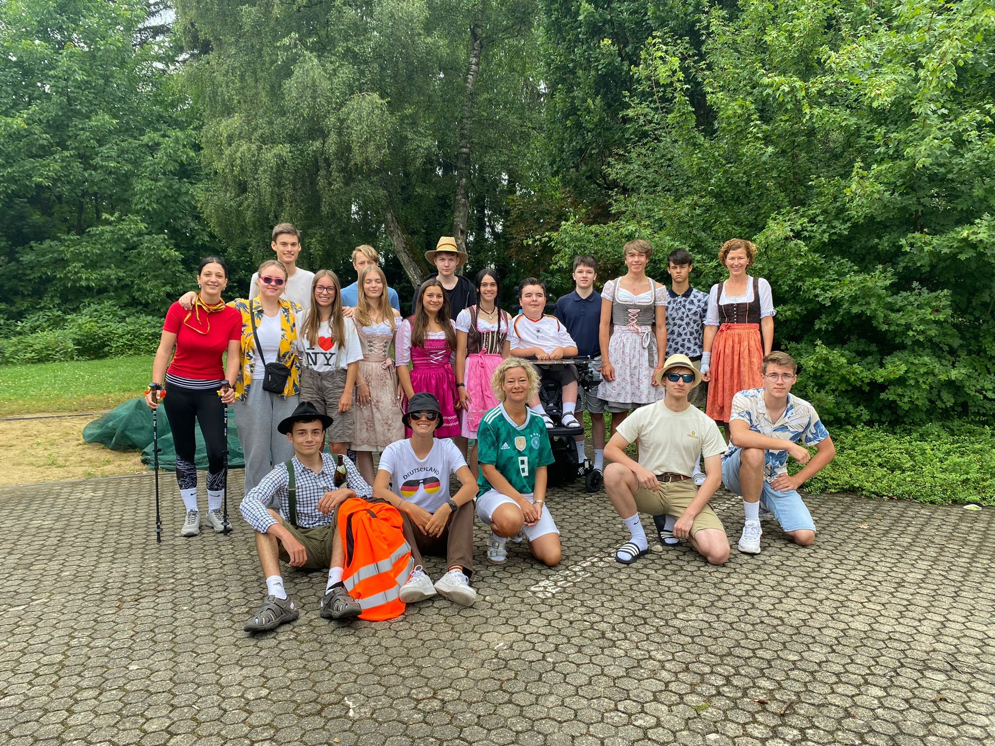 Die Woche vom 20.06 bis zum 24.06 startete mit „Everything but a bag“, also musste man seinen Schulranzen ersetzen. Wir waren sehr kreativ und brachten Katzenboxen, Rolatoren aber auch Einkaufswägen als Transportmittel für unsere Schulsachen mit. Am Dienstag haben wir die Zeitmaschine angeworfen und sind zurück in die „70er und 80er Jahre“ gereist, aber auch „Flowerpower“ war sehr angesagt. Am nächsten Tag gings mit der Zeitmaschine zurück ins hier und jetzt-nach Deutschland. Nach dem Motto „Typisch Deutsch“ war von Nationalspielern über Bayern bis hin zu Wanderern alles vertreten. Am Donnerstag ist der gesamte Unterricht entfallen, daher wurde das Motto „Kindheitshelden“ auf den folgenden Dienstag verschoben. Zum Glück konnten es sich Robin Hood, die Minions und die wilden Kerle auch am Dienstag einrichten J. Beim krönenden Abschluss, dem „Roten Teppich“ durfte sich jeder nochmal „herausputzen“