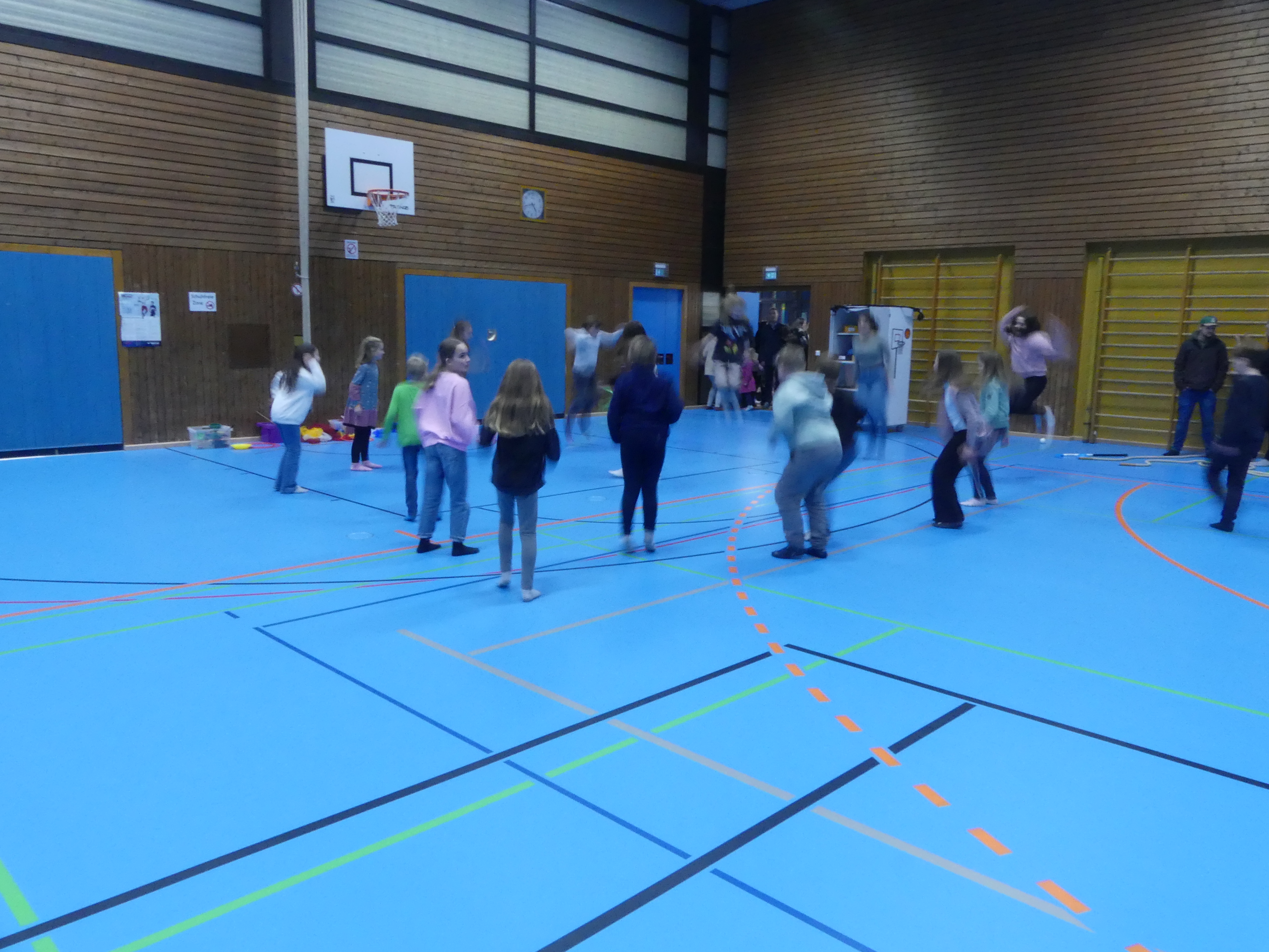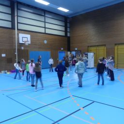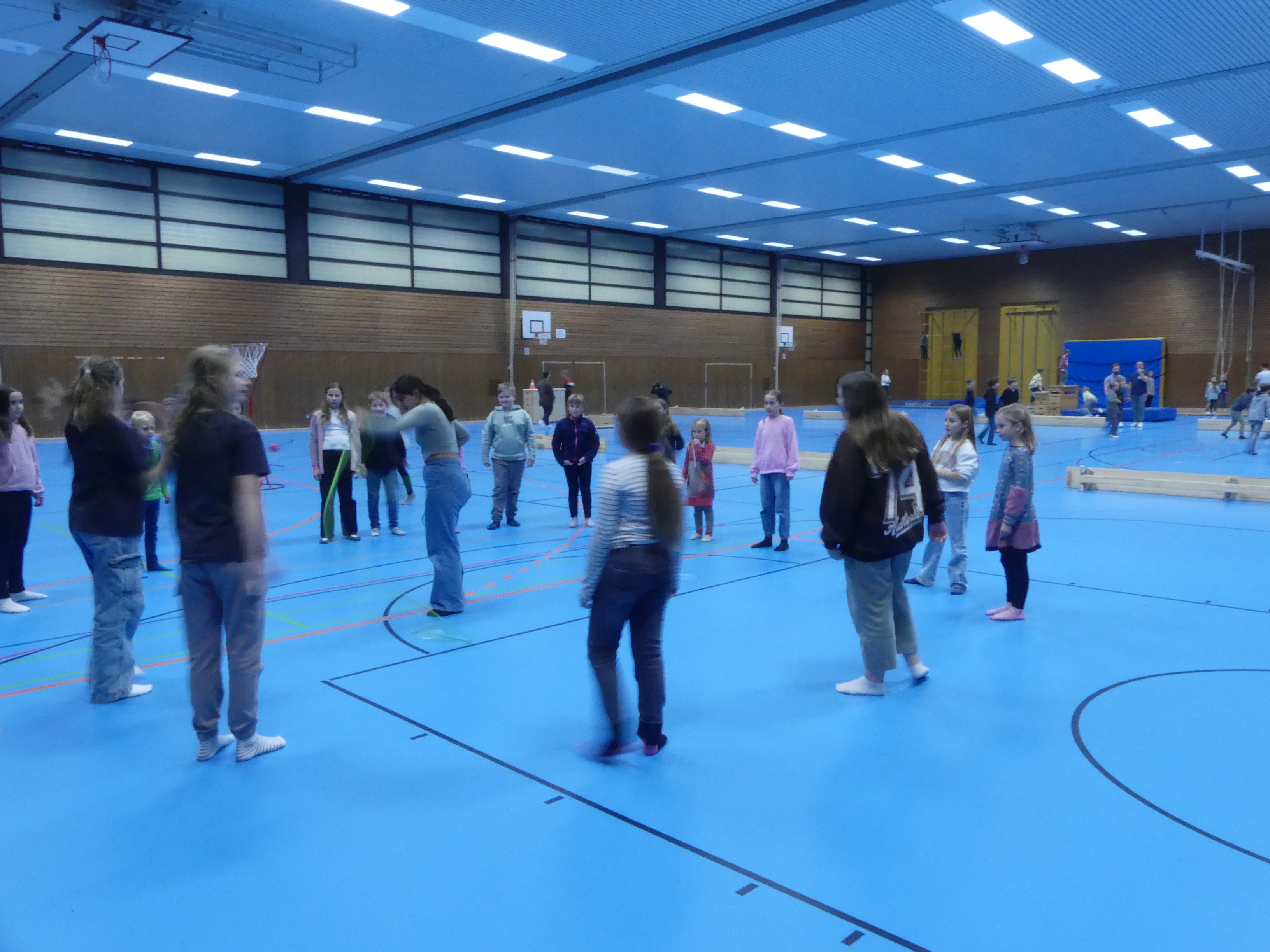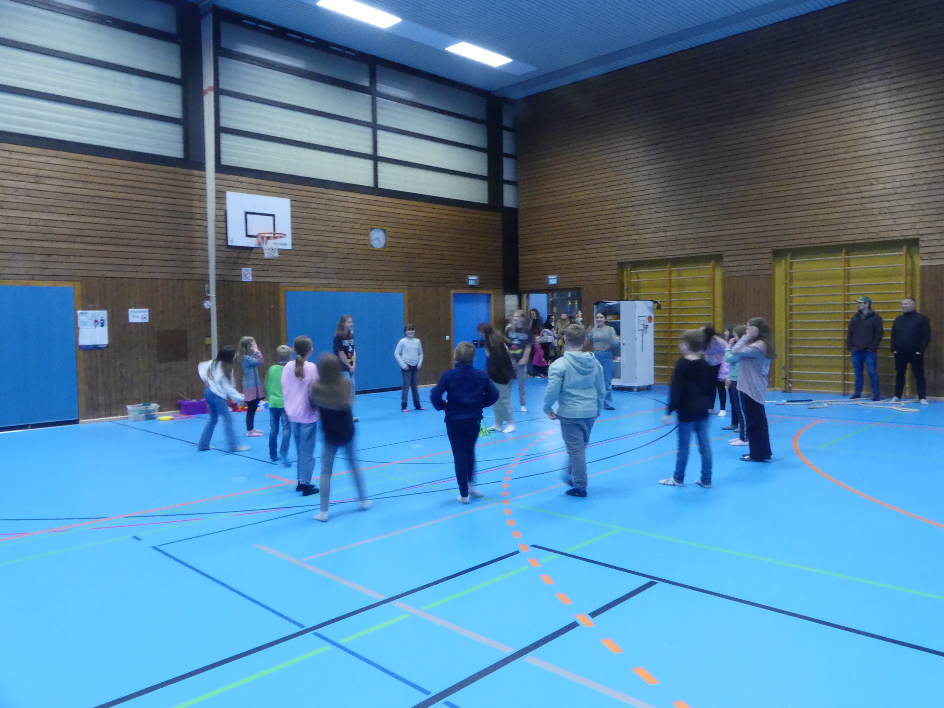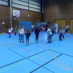 Der gelungene Nachmittag fand seinen Ausklang in der Sporthalle. Hier, am Zielpunkt der Schulhausrallye, wurden die Schülerinnen und Schüler, nachdem sie alle sechs Stationen durchlaufen hatten, mit verschiedenen Spielen unterhalten und dann schließlich von ihren Eltern abgeholt.