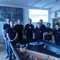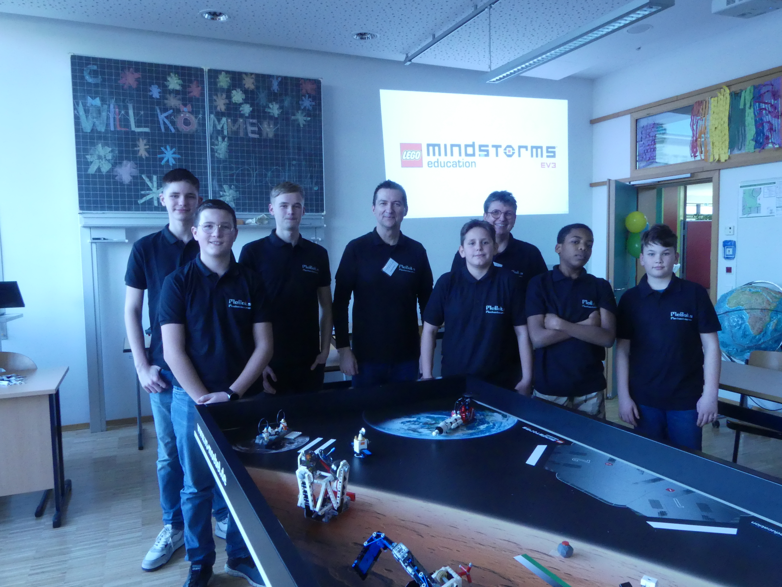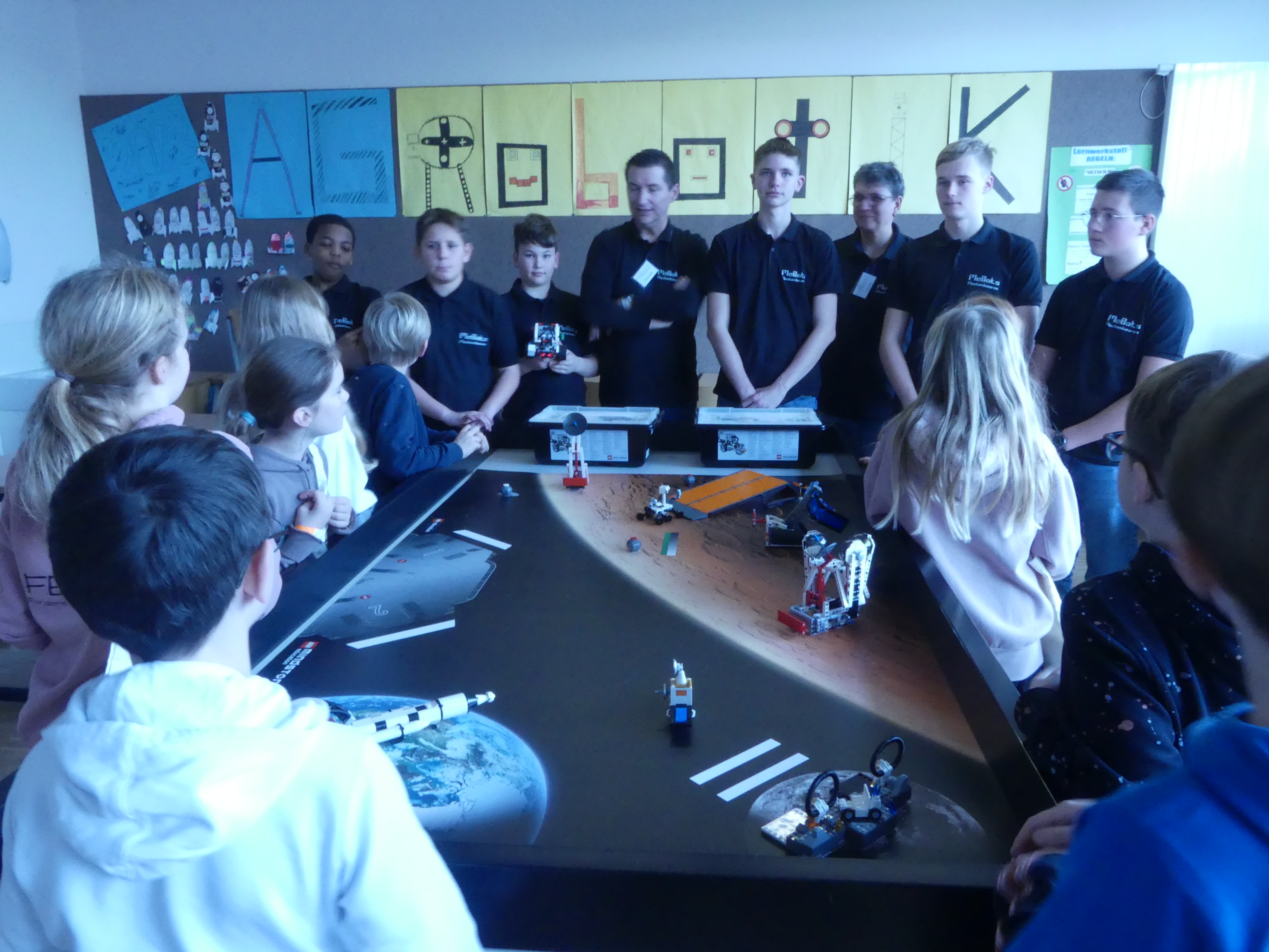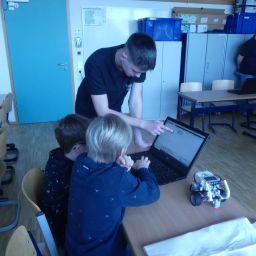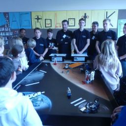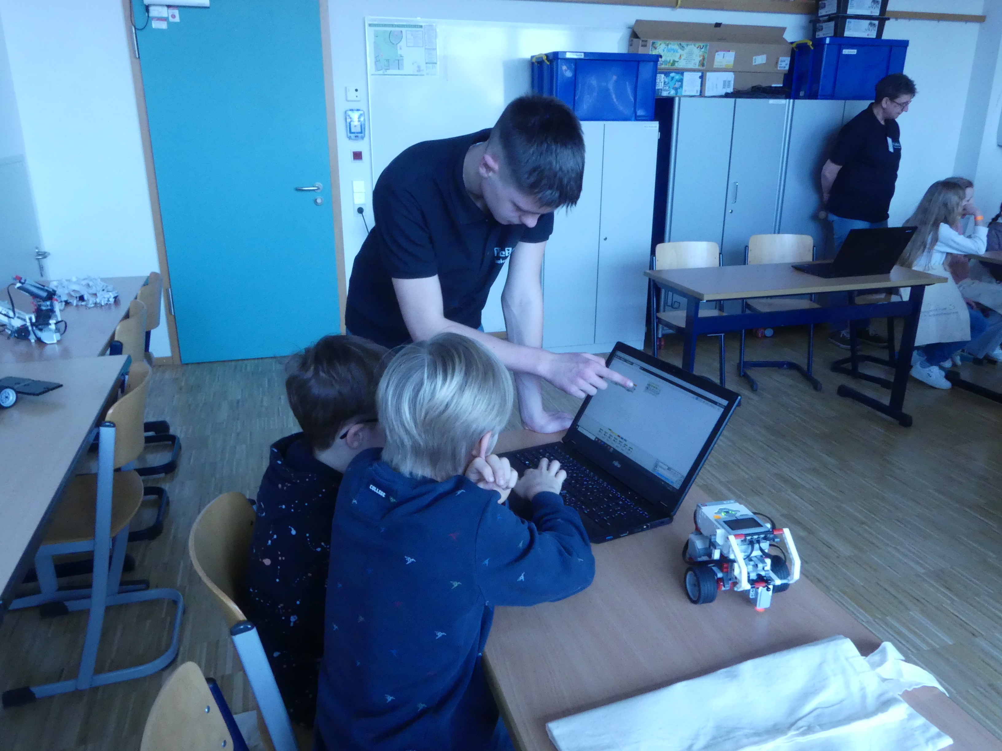 Zimmer der Robotik-AG an der Programmierung eines Roboters mitwirken.