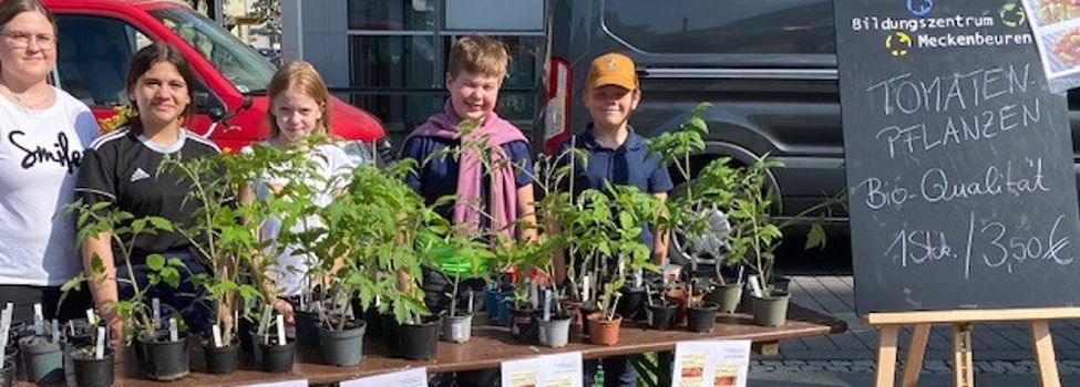 Am Mittwoch, 11.05.2022 war es wieder soweit, die Schülerinnen und Schüler der Klasse 5b des Bildungszentrums Meckenbeuren haben ihre sorgfältig gezogenen Tomatenpflanzen zum Verkauf angeboten.